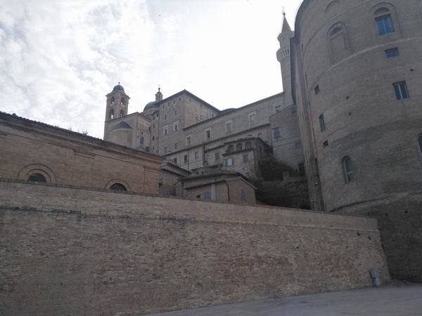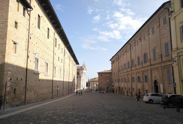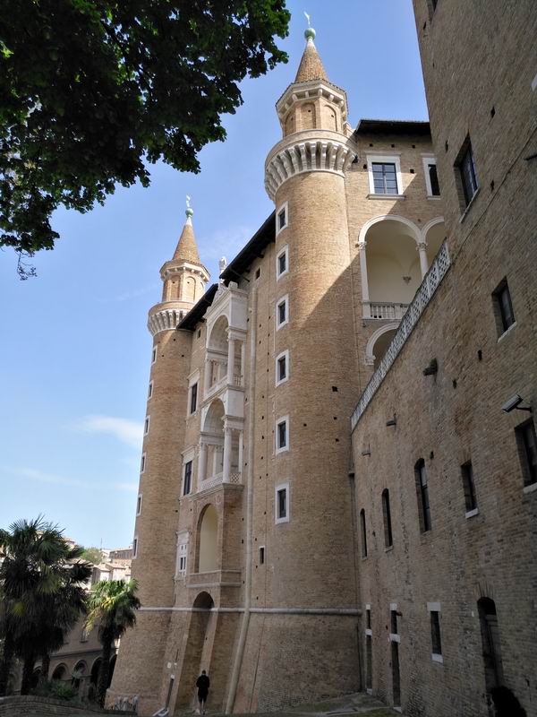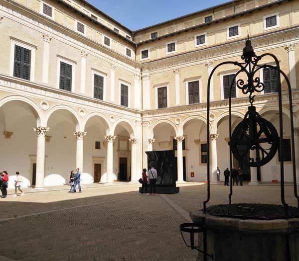 乌尔比诺的公爵宫位于城市最重要的地段,虽然不是城市的地理中心,但是因其靠近城墙而显得高大威严。它的西立面居高临下,高达四五层,中间几层呈现出凯旋门式样的敞廊,这在当时是非常流行的建筑样式,借鉴的是古罗马的凯旋门样式。在里米尼,也有阿尔伯蒂设计的类似的建筑,只是没有乌尔比诺的壮观。公爵宫是个有矩形中庭的堡垒式建筑,周围有两座塔楼,可以爬到其中一座的顶层,在上面俯瞰整座城市和周围辽阔的乡间。