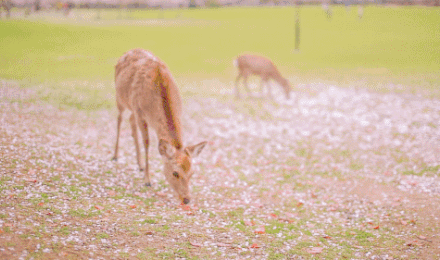 奈良公园以可爱的小鹿闻名世界,而春天来到这里就更多了一份对樱花的期待,鹿群在园内闲散游走,坐卧于满开的樱花林间,一地粉色花瓣更衬得这景象宛如仙境。